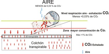 El CO2 es un gas que pesa un 50% más que el aire y por tanto, por efecto de la gravedad tiende a caer. En una posición horizontal el bebé exhalará el CO2 que quedará acumulándose sobre la superficie del colchón. Algunos colchones son más transpirables que otros. Tardarán más o menos tiempo en disipar este gas en función de la capacidad de transpiración de los materiales. En el caso de nuestro colchón SEDACONFORT da igual que los materiales sean más o menos transpirables, ya que al estar el bebé inclinado, el gas caerá hacia la zona más baja, dejando libre totalmente la zona de respiración del bebé por lo que tendremos la seguridad de que nuestro bebé no reinhalará el CO2 (Concentración de CO2 en aire limpio <0.03%) exhalado por su propia respiración.