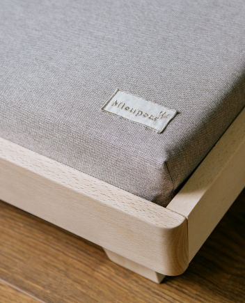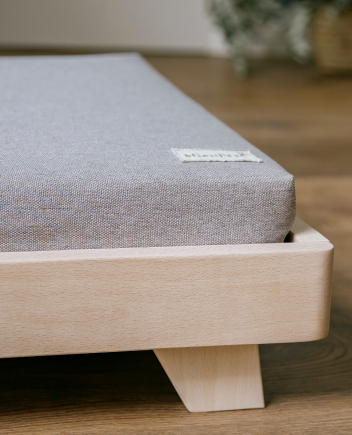Una cama realizada en madera maciza de haya proveniente de bosques sostenibles, con recubrimiento al agua y protección antibacteriana para cuidar de su salud.
